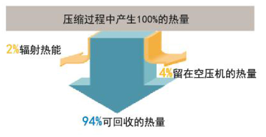 壓縮過程中產生的熱量,其中約2%通過電機等高溫部件直接輻射排放;約4%留在空壓機內部不可回收:約94%通過冷卻設備間接排放,這部分熱量是可以被回收利用。